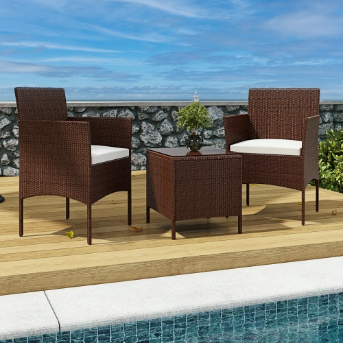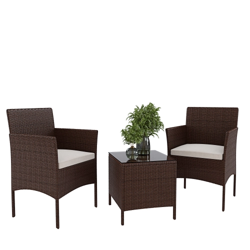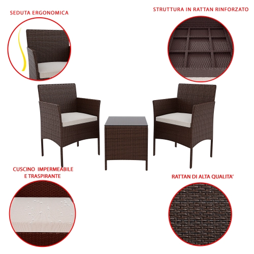 Il set è composto da 2 poltroncine ed un tavolino basso con ripiano in vetro.